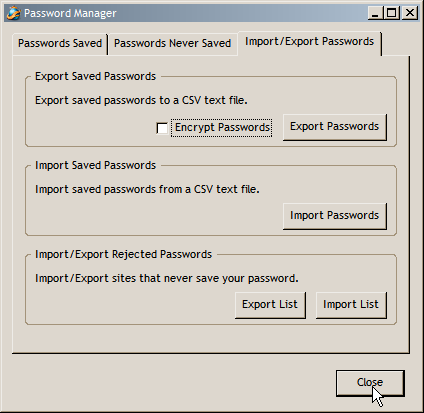 ここで,Export Passwords ボタンをクリックすると,パスワード情報をテキストファイルに出力することができます.Encrypt Passwords にチェックをいれておけば,パスワード部分の文字列が暗号化された状態で出力されます.